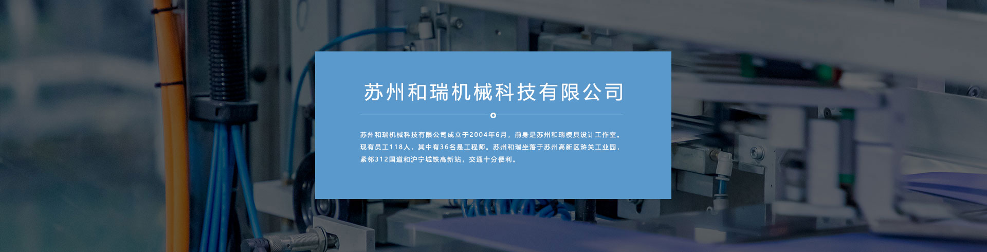 蘇州和瑞機械有限公司成立于2004年6月,前身是蘇州和瑞模具設計工作室。現有員工118人,其中有36名是工程師。蘇州和瑞坐落于蘇州高新區滸關工業園,緊鄰312國道和滬寧城鐵高新站,交通十分便利。
